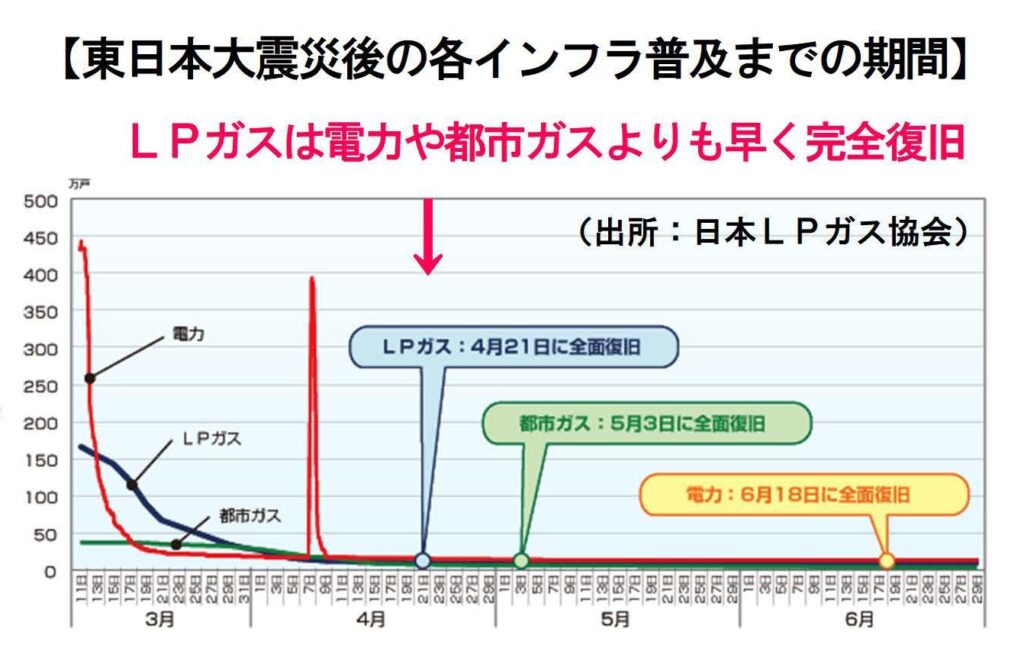 LPガスは東日本大震災を契機に、災害時の強靭性が見直されてきています。各戸で独立した供給を行っているために復旧が早いこともありますし、長期保存が可能な燃料として「備蓄燃料」としての活用が推進されています。