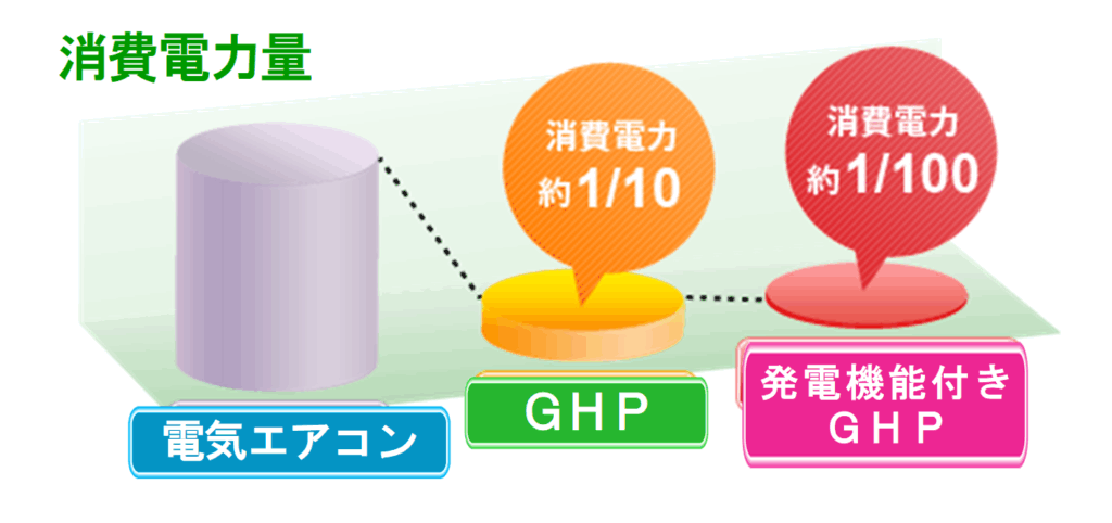 電源自立型GHPの導入の場合、現在の消費電力量の削減にもつながります。災害時の備えのみならず、日常の効率化にも役立つ設備です。